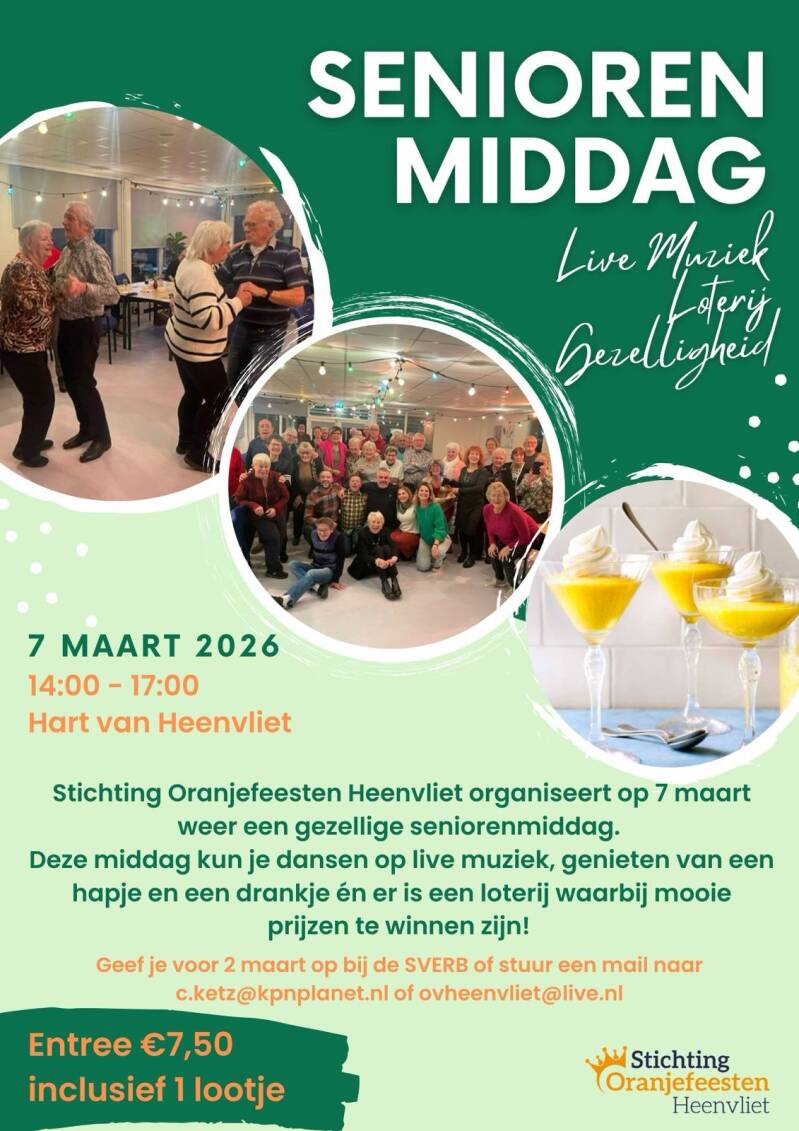 Donderdag 26 februari Hart van Heenvliet ’s ochtends: meer bewegen voor ouderen ‘s middags: creamiddag Let op: neem je deel aan beide activiteiten, neem dan zelf een lunchpakketje mee